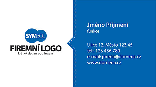 Dvoubarevné vizitky. Jednoduchá dvoubarevná vizitka rozdělená na levou bílou část s logem a pravou barevnou část s kontakty. Na výběr je několik základních barev, ale není problém barvu pruhu libovolně změnit nebo doladit třeba podle barvy loga.