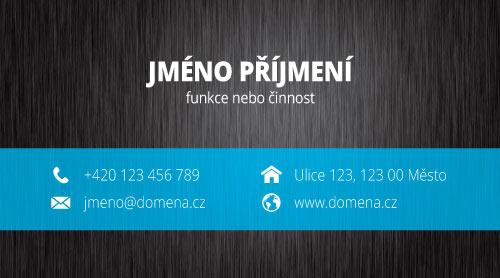 Vizitky s pozadím z broušeného hliníku. Vizitka s tmavým pozadím imitujícím broušený hliník. Na vizitce je barevný pruh s kontakty, barvu pruhu je možně změnit na jakoukoliv barvu. Tyto vizitky objednávají převážně muži.