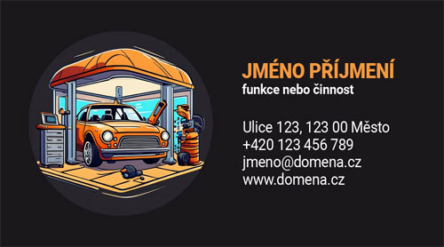 Vizitky pro autoservis. Vizitky pro autoservis s černým pozadím a barevným ručně kresleným obrázkem auta a servisní dílny.