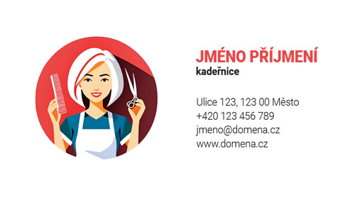 Vizitky pro kadeřnictví. Návrh vizitky pro kadeřnictví s kresleným obrázkem a bílým pozadím.